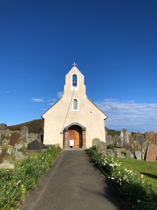 Beautifully maintained church and graveyard with the house of crosses . Fantastic Celtic and Viking crosses that have been saved from elsewhere on the island.